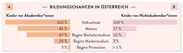Übungen sortieren nach ... —~—~—~—~—~—~—~—~— » Variante mit Lücken » Variante mit Pull-Down-Menü » Variante mit Drag'n'Drop - Olha Moroz - Bazalová - Britta - Eliane - Fabio Lai - Jindriska - Michael - Natalia - Sprachen Horizonte >>> zurück zur Startseite Link kopiert! ♣ Ergänzen Sie die Sätze.die beiden Grafiken vergleicht | Die Grafiken zeigen | als in Grafik A | Man sieht in den Grafiken | Es fällt auf | Während in Grafik A | in Grafik B Schriftgrösse ändern die Bildungschancen von Kindern in Österreich. , dass alle Kinder die Volksschule besuchen. Ein Teil davon, nämlich 81 % der Kinder, deren Eltern Akademikerinnen sind, und 37 % der Kinder, deren Eltern Nichtakademikerinnen sind, machen die Matura. Wenn man , kann man sagen, dass nur wenige Kinder von Nichtakademikerinnen studieren. Nur noch 22 % der Kinder von Nichtakademikerinnen beginnen ein Bachelorstudium. , dass deutlich mehr Kinder von Akademiker*innen anfangen zu studieren, nämlich 67 %. Interessant ist, dass nur sehr wenige Kinder von Nichtakademiker*innen ein Masterstudium oder eine Promotion beginnen. 25 % ein Masterstudium beginnen, sind es nur 7 %. In Grafik B beginnen auch weniger Kinder ein Promotionsstudium .