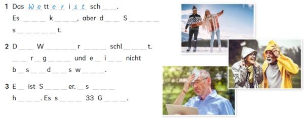 Übungen sortieren nach ... —~—~—~—~—~—~—~—~— » Variante mit Lücken » Variante mit Pull-Down-Menü » Variante mit Drag'n'Drop - Olha Moroz - Bazalová - Britta - Eliane - Fabio Lai - Jindriska - Michael - Natalia - Sprachen Horizonte >>> zurück zur Startseite Link kopiert! ♣ Wie ist das Wetter? Sehen Sie die Fotos an und ergänzen Sie.kalt | Wind | Grad | heiß | scheint | besonders | regnet | schön Schriftgrösse ändern 1. Das Wetter ist . Es ist , aber die Sonne . 2. Der ist sehr schlecht. Es und es ist nicht warm. 3. Es ist Sommer, es ist sehr . Es sind 33 .