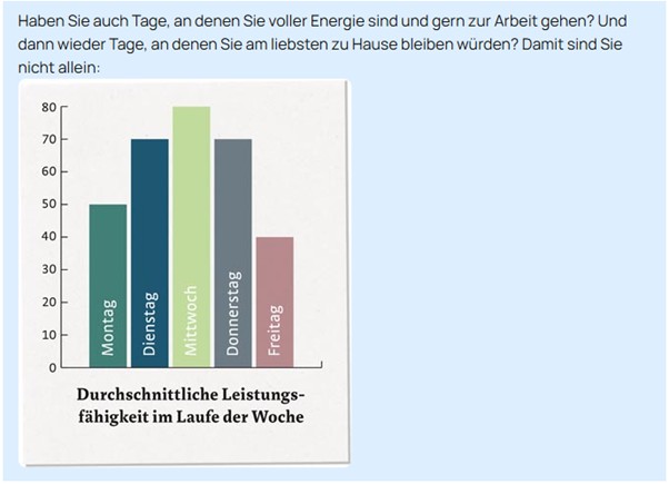 ♣ Lesen Sie den Text zum Schaubild und schreiben Sie die Sätzegrößte Tief haben die meisten | die Leistungskurve wieder | ab Dienstag | Donnerstag fällt | das Energielevel sehr niedrig | größte Hoch hat man am Mittwoch![]()